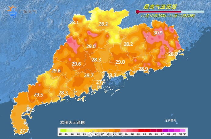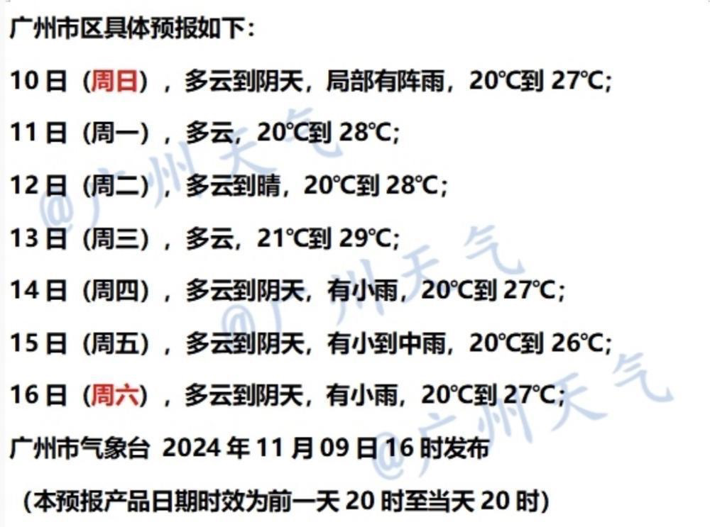 广州市气象台11月9日傍晚市区七天预报。图/@广州天气