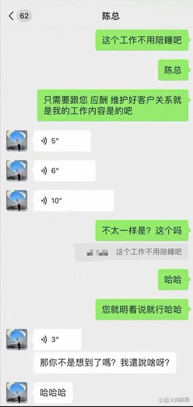 据网传截图,发布者表示去这家公司面试,一开始只要求配合经理工作偶尔应酬,试岗时却被要求必须陪睡,聊天记录显示该公司陈总还要跟女生处对象。