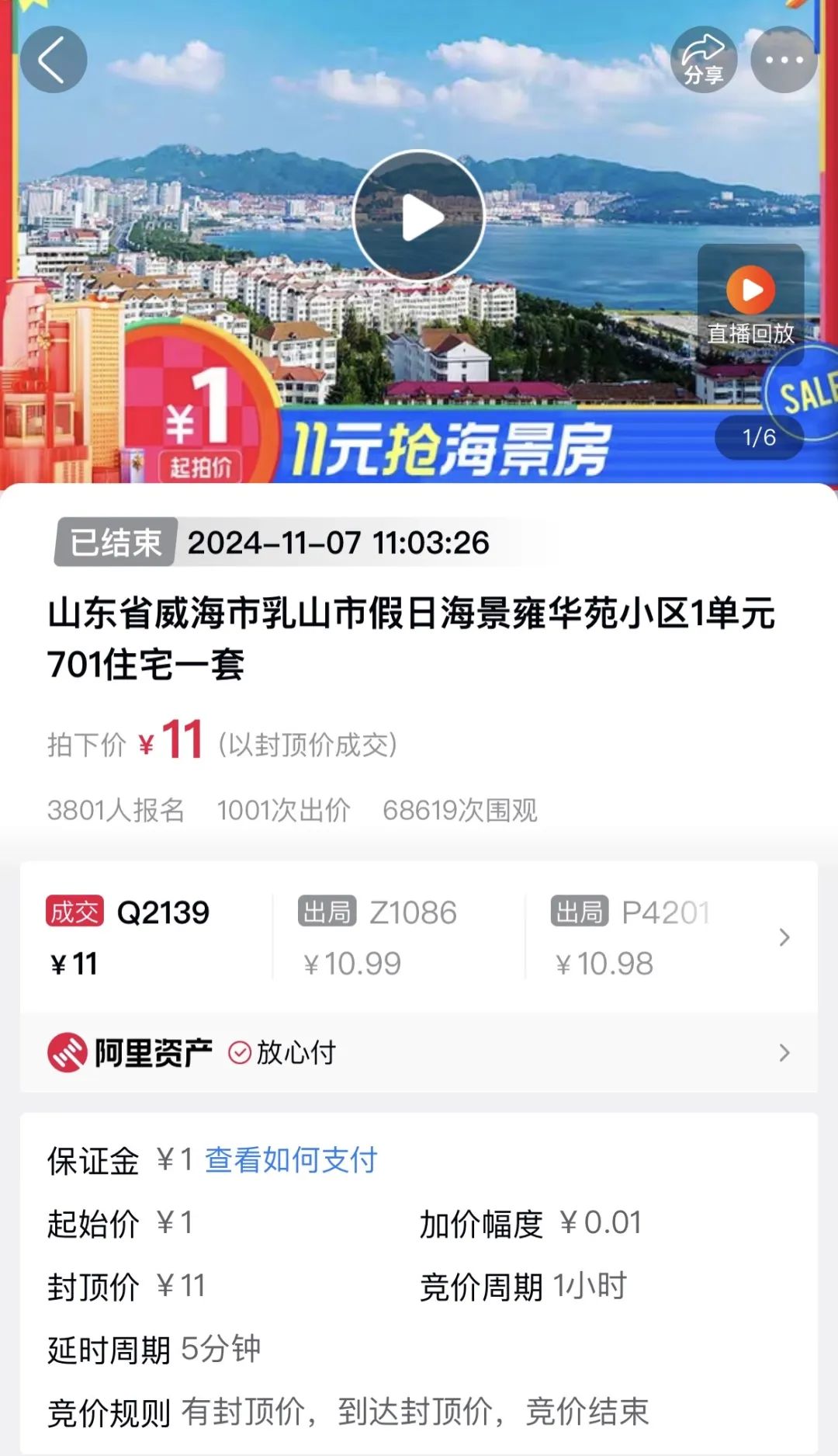 据报道,近日,一名女子以11元拍下山东威海乳山一套海景房的消息引发较大的关注。记者在阿里资产平台查询发现,成交纪录确实存在。