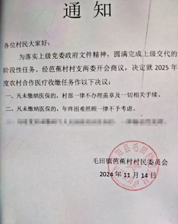 11月14日,一则关于湖南岳阳县毛田镇芭蕉村发布的农村合作医疗收缴任务通知在网上传播,引发关注。 该通知称,经芭蕉村村支两委开会商议,决定就2025年度农村合作医疗收缴任务作以下决议:一、凡未缴纳医保的,村部一律不办理盖章及一切相关手续。二、凡未缴纳医保的,年终困难照顾一律不予考虑……