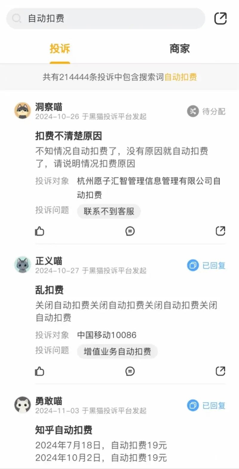 记者在黑猫投诉平台搜索“自动续费”,跳出的投诉超过21万条。投诉内容主要包括:App开通自动续费后从未被提醒就扣费;自动续费机制不合理,已经关闭自动续费却仍扣费;未到期限提前自动续费扣款;自动续费提醒发到App消息框等,用户难以发现;长时间未登录甚至已删除App,仍在自动续费且没有任何短信提示。