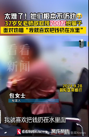 9月28日下午,上海普陀区某银行内,一名37岁培训机构女老师欲取现金700万元,还不愿说出取钱理由,但民警查到她曾转账给涉诈账号。