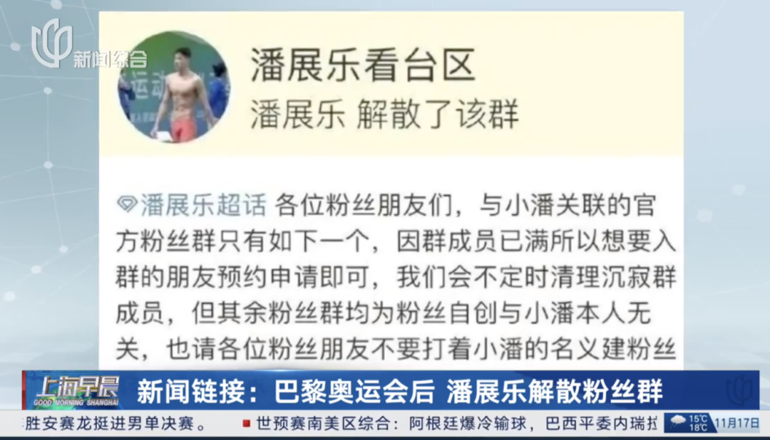 今年8月12日晚,在刚闭幕的巴黎奥运会上大放异彩的中国游泳运动员潘展乐,在微博解散了自己的官方粉丝群,也曾引起广泛关注。