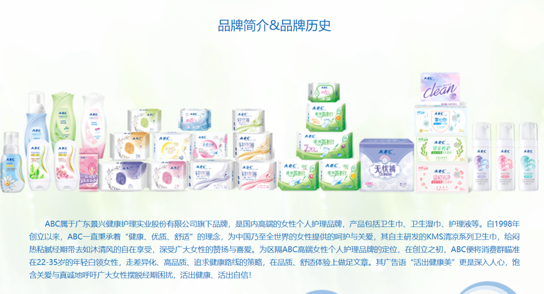 官网资料显示,ABC是国内高端女性个人护理品牌,产品包括卫生巾、卫生湿巾、护理液等,创立于1998年。当前品牌代言人为孟子义。