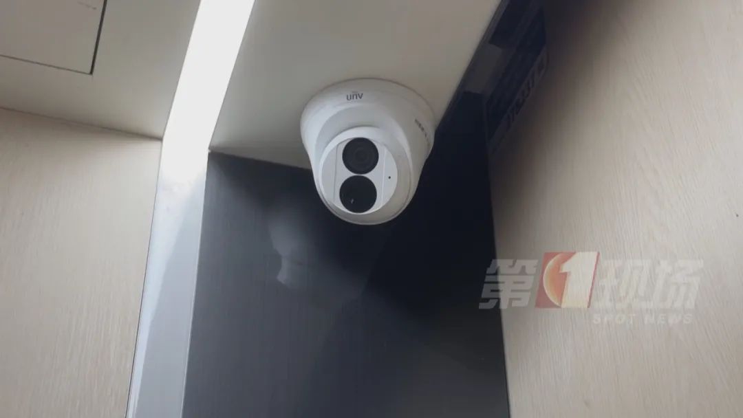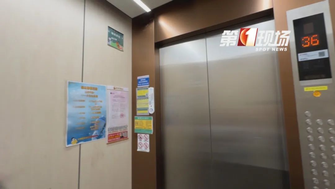 记者来到涉事楼栋,电梯里的布局和视角,跟早上看直播画面是一样的。