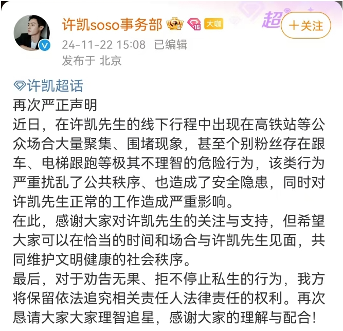 2016年,签约成为欢娱影视旗下艺人。代表作品《延禧攻略》《招摇》等。2023年9月17日,许凯作为杭州第19届亚运会火炬传递金华站第163棒火炬手,传递杭州亚运会火炬。