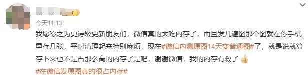 所以,对于微信内测“原图、原视频14天自动清理”功能,不少网友直言:自己的内存终于“有救了”。