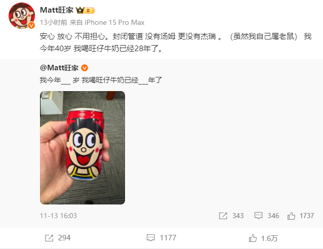 22日晚,旺旺集团首席营运官 Matt旺家发文回应了旺仔牛奶中喝出老鼠事件。“安心、放心、不用担心。封闭管道,没有汤姆,更没有杰瑞(虽然我自己属老鼠)。我今年40岁,我喝旺仔牛奶已经28年了。”