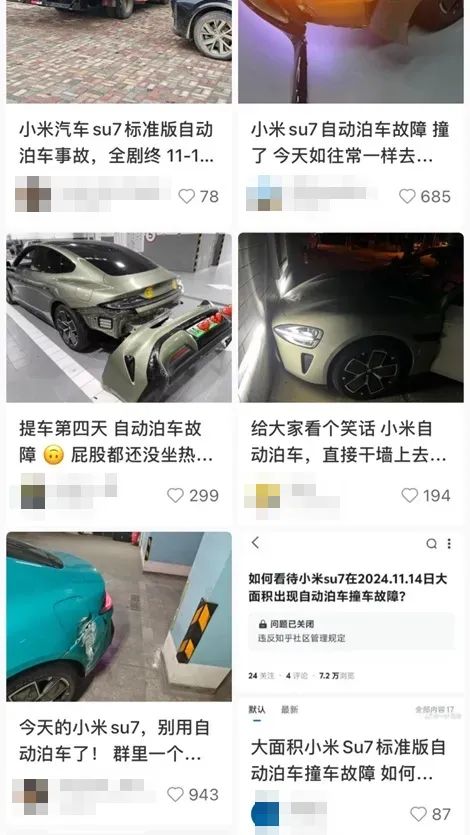近日,多名车主反映 小米汽车SU7标准版 “自动泊车”功能出现故障 造成不同程度的撞击、剐蹭损伤据媒体报道,截至11月20日,统计到70多位小米SU7标准版车主在11月14日中午至11月15日凌晨因自动泊车功能故障,导致车辆泊车过程中发生剐蹭和碰撞。小米官方对车主表示,愿意承担全部维修费用,并提供积分补偿。据小米汽车公开信息,自动泊车又称智能泊车,驾驶员行驶车辆至车位附近后,开启自动泊车功能,车辆将识别目标车位并自动泊入。11月14日,来自北京的小米SU7标准版车主孙鹏(化名),就因自动泊车功能故障,导致车辆尾部变形、磨损。当天晚上6点多,孙鹏像往常一样驾车回家驶入地下车库,并开启自动泊车功能。刚开始功能运行一切正常,直到车尾突然撞上停车位旁边的柱子。孙鹏称,撞击前,倒车雷达没有识别到障碍物,防撞预警的警报声也没有响起。“撞上去之后,自动泊车的程序也没有停止,一直在运行,车子也一直在给油,所以损伤是比较严重的。”孙鹏告诉记者,自今年4月购买小米SU7标准版后,每次回家进入车库停车,他都会使用自动泊车的功能,从未出现问题,同一地点同一停车位“使用自动泊车功能不下百次”。一开始,小米客服表示需要车主本人上报保险公司。但在11月14日晚上,孙鹏在社交平台发现,有多位小米SU7车主发生了同样的事故。截至11月20日,孙鹏所在的“小米SU7标准版事故车主群”,统计到70多位小米SU7标准版车主,在11月14日中午至11月15日凌晨,因自动泊车功能异常而发生撞击、剐蹭。