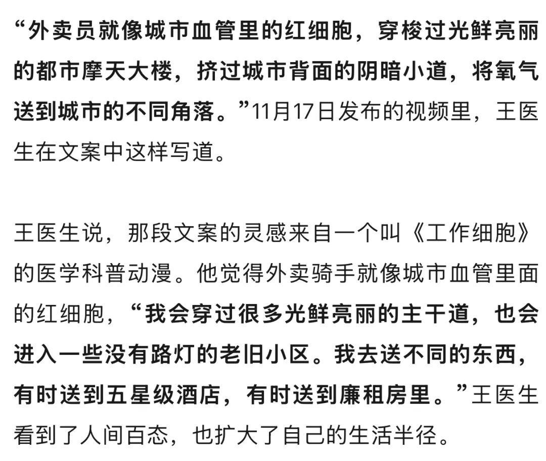 从这之后,王医生每逢工作紧张压力大,下班后就穿上外卖员的衣服送上两三单