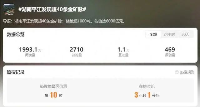 近日,“湖南平江发现超40条金矿脉”冲上热搜。