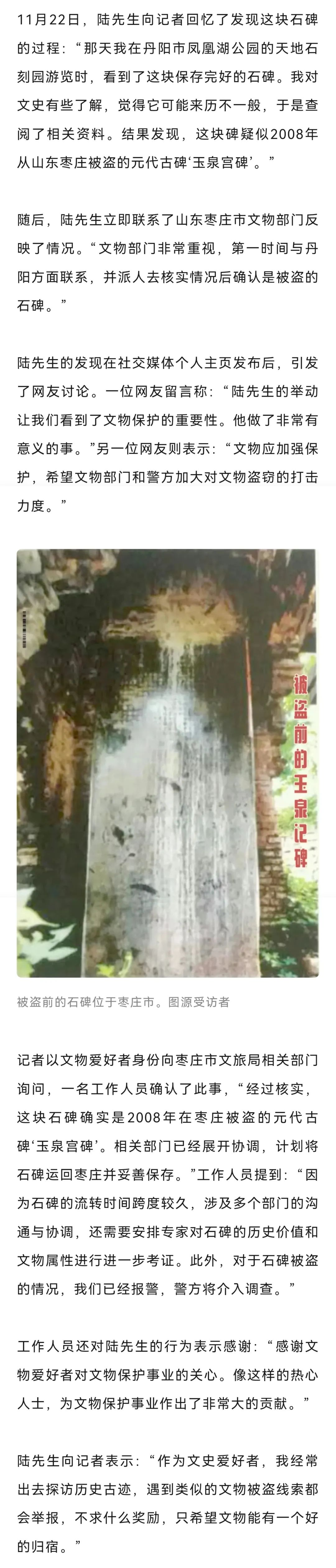 : 近日,江苏省丹阳市凤凰湖公园(原名:天地石刻园)内的一块元代石碑引发了网友关注。这块疑似山东枣庄2008年被盗“玉泉宫碑”的元代古碑,被江苏陆先生偶然发现并上报相关部门。如今元代石碑位于江苏丹阳市一公园内 ...