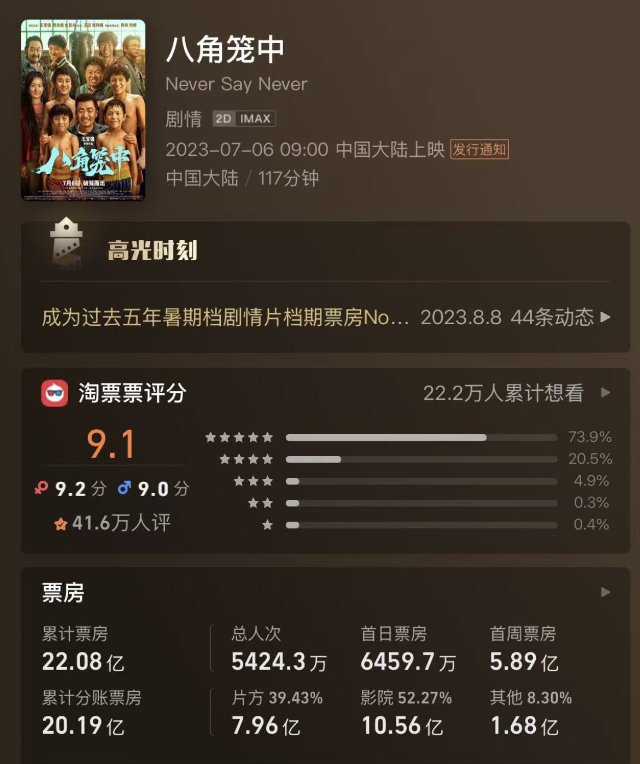 2023年7月6日,《八角笼中》上映,最终累计票房22.08亿。