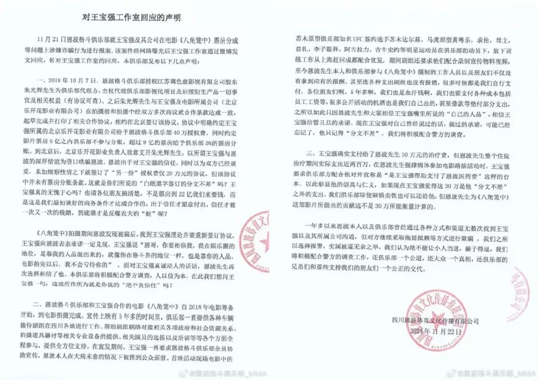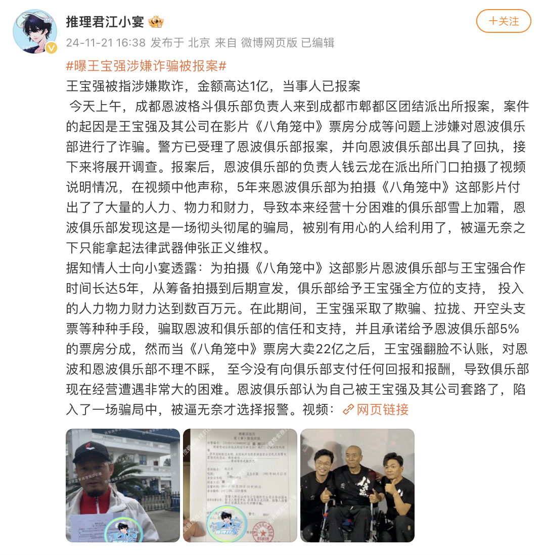 11月21日,@推理君江小宴 发微博称,成都恩波格斗俱乐部负责人钱某,因其与王宝强及他的公司在电影《八角笼中》的票房分成上存在问题,钱某前往派出所报案。