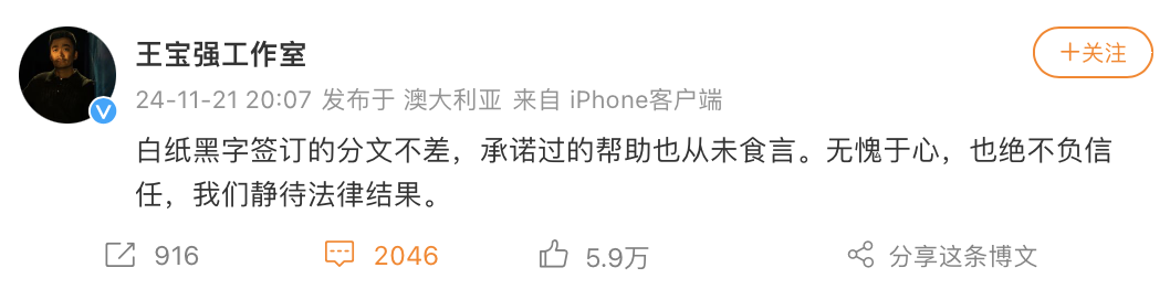 对于此爆料,王宝强工作室回应称:白纸黑字签订的分文不差,承诺过的帮助也从未食言。无愧于心,也绝不负信任,我们静待法律结果。