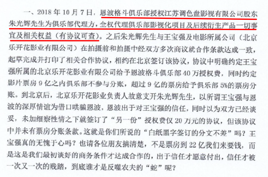 钱某提到,王宝强当初承诺给予恩波俱乐部5%的票房分成,如今电影大卖22亿,王宝强应该分给他们1.1亿(22亿X5%=1.1亿)的回报。