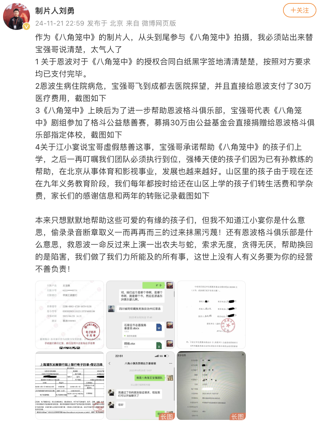 涉事影片《八角笼中》的制片人刘勇也深夜发布长文力挺王宝强,同时还晒出王宝强对恩波格斗俱乐部的现金转账记录。在恩波病危时,王宝强还自掏腰包付了30万医疗费用。