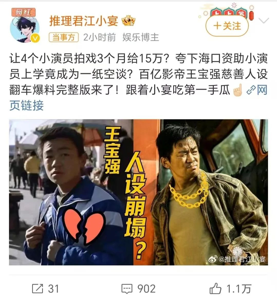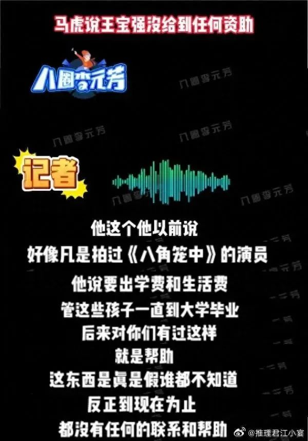 值得注意的是,今年10月16日,江小宴还曾爆料称“王宝强的慈善人设”翻车,王宝强曾承诺资助《八角笼中》的小演员们的学费和生活费,一直管这些孩子直到大学毕业。但却被参影小演员控诉,影片宣传期结束后却一直都没有给任何资助。
