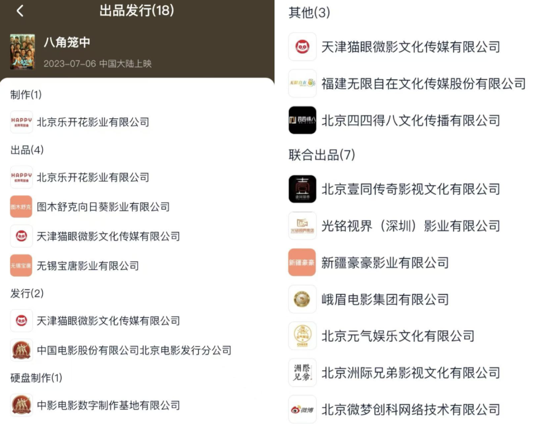 看到背后的出品发行方共有18家,包括「北京乐开花影业有限公司」、「图木舒克向日葵影业有限公司」、「天津猫眼微影文化传媒有限公司」、「无锡宝唐影业有限公司」等。