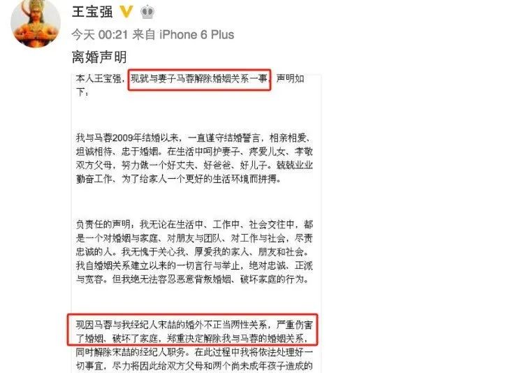 2016年8月,王宝强一纸公告踢爆妻子马蓉与经纪人宋喆不正当两性关系,王宝强宣布与马蓉解除婚姻关系,同时解除宋喆经纪人职务。