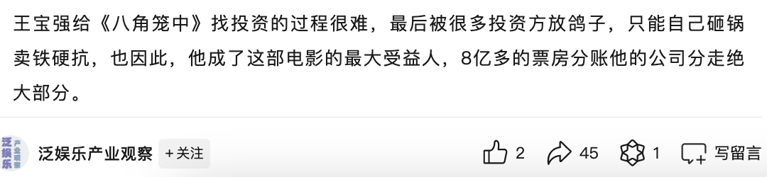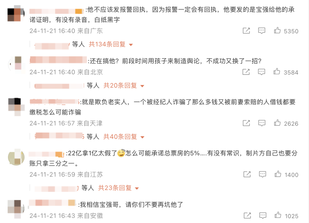 不过,不少看了爆料的网友表示,“他不应该发报警回执,应该发宝强给他的承诺证明,有没有录音,白纸黑字”、“22亿拿1亿太假了,怎么可能承诺总票房的5%……有没有常识,制片方自己也要分账只拿三分之一”……