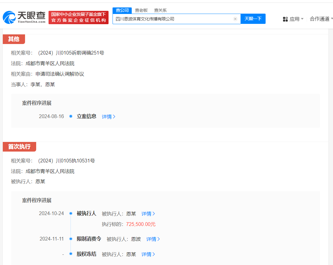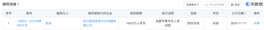 风险信息显示,近日,恩波所持该公司100万人民币股权被冻结,冻结期限3年,执行法院为成都市青羊区人民法院。案件流程信息显示,不久前,恩波被强制执行72.55万元,并被限制高消费。