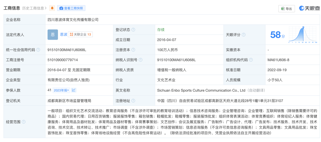 今年6月25日,「成都恩波格斗文化传媒有限责任公司」成立,法定代表人为恩波,注册资本100万人民币,经营范围包括体育经纪人服务、文化娱乐经纪人服务、品牌管理、组织文化艺术交流活动等,由恩波持股51%。