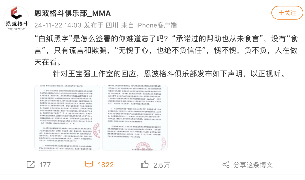 今天(11月22日)下午,恩波格斗俱乐部发盖章公告回应王宝强工作室的言论,称:人在做天在看。
