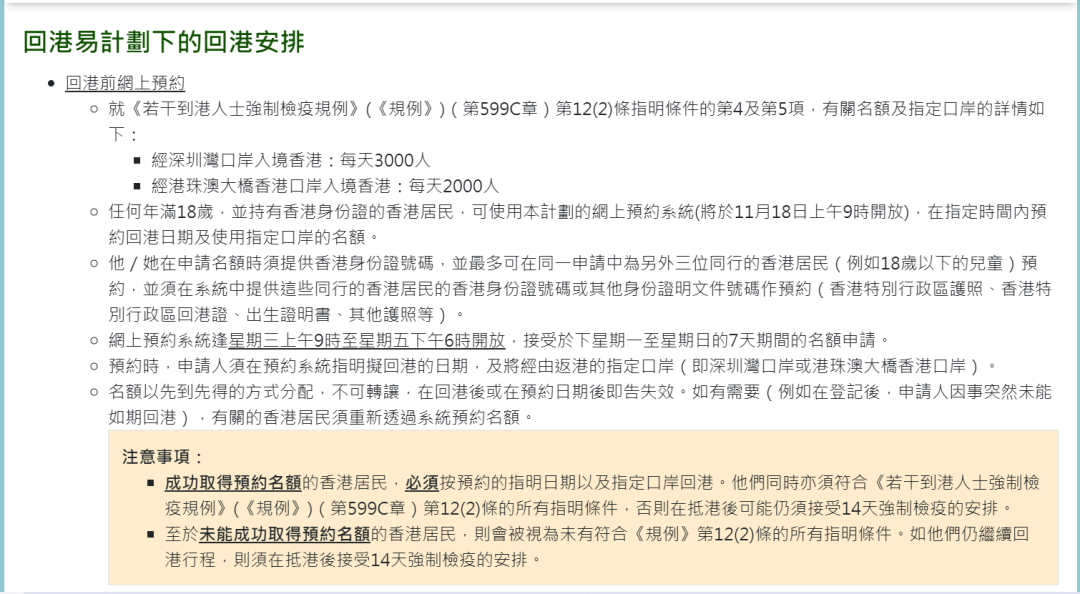 据介绍,参与计划的人士必须符合4项条件:必须是香港居民;回港前14天内没有到过香港、澳门、广东以外其他地区;持有由粤港或港澳两地认可机构发出的病毒核酸检测阴性证明,检测结果证明须在回港当天或前3天内发出才算有效;预先取得“回港易”计划的预约名额。 预约系统逢星期三上午9时至星期五下午6时开放,接受于星期一至星期日的7天期间的名额申请。 △图源香港特区政府 在计划初期,深圳湾口岸每日提供3000个名额,港珠澳大桥每日名额为2000个,广东省有39间粤港两地互认医疗机构,澳门则有4间,申请人可将检测阴性结果上传至申报系统,取得绿色二维码入境香港。 △图源香港特区政府 香港特区政府政制及内地事务局主任(特别职务)袁民忠表示,两个口岸会设立绿色专用通道以方便有关人士,绿色二维码只有24小时有效期限,他提醒,申请人只需在回港前24小时将检测阴性报告上传至卫生署电子申报系统即可。 袁民忠强调,有关人士如果想返回广东省和澳门特区,则需要根据相关检疫措施要求,强制检疫14天。 来源:大湾区之声 |