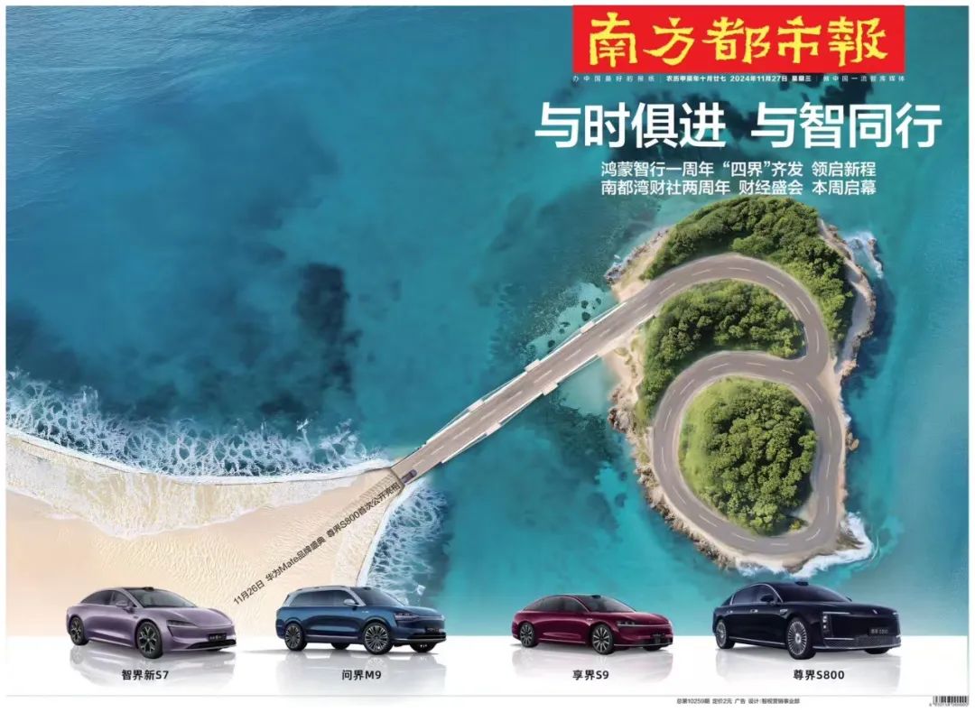 在外观上,尊界S800实车采用天地人和的设计理念,汇聚时代群星的力量,探索宇宙的无垠。全新纵横星瀚设计语言,带来极致豪华、智慧的辨识度,将成为尊界的家族化设计特征。车头运用四横两纵元素,展现出立天地纵横、汇万象合一的气度。在几年前还难以想象,中国车企能够造出自己的百万级豪车,在国际舞台上与BBA一较高下。鸿蒙智行希望以豪华质感和智能化体验去跨代际超越传统的BBA旗舰车型,改写传统豪华车市场格局。在燃油车时代,传统的豪华车市场被BBA(奔驰、宝马、奥迪)“三分天下”。随着智能电动汽车时代的来临,中国的新能源汽车“变道超车”,以“三电”技术(电机、电控、电池)打破燃油车三大件(发动机、变速箱、底盘)的技术壁垒,开创了属于自己的“黄金时代”。今年10月,国内市场新能源汽车渗透率达52.9%,并且连续4个月超过50%;国内自主汽车品牌的总市场份额也达到了65.7%,同比增加10.1%。外资车企主导中国汽车市场的时代,已经成为过去。11月14日,中国汽车工业协会发布消息称,我国新能源汽车年产量首次突破了1000万辆,成为全球首个新能源汽车年度达产1000万辆的国家。过去10年,中国新能源汽车产销量已连续9年位居全球第一。与时代共舞,鸿蒙智行应运而生,秉承帮助中国车企“造好车、卖好车”的使命,持续领跑智能电动汽车的新发展,带来极致的智慧出行体验,把数字世界带入每一辆车。11月15日至24日,在第二十二届广州国际汽车展上,鸿蒙智行首次携问界、智界、享界、尊界“四界”产品家族同台亮相,成为车展上的“人气王”。随着“四界”齐发,技术共享,鸿蒙智行为智能电动汽车时代注入更多变量,也在悄然改写传统豪华车的市场格局。第二十二届广州国际汽车展,鸿蒙智行首次携“四界”产品同台亮相很多人也会发问,打造百万级豪车,鸿蒙智行的底气何在?一方面,这得益于华为作为高端品牌的形象已经深入人心,构建起了品牌护城河;另一方面,依托华为30多年的技术积累,尤其是华为终端领域十几年的技术积淀,以及在供应链管理、研发、制造、测试全流程的经验,鸿蒙智行具备了快速切入智能电动汽车赛道的实力。从公开数据来看,鸿蒙智行帮助车企“造好车、卖好车”也已经取得了阶段性的成功。截至2024年10月,历时32个月交付50万辆,鸿蒙智行创造中国新势力最快交付记录,并蝉联中国新势力品牌销冠、50万以上车型销冠。其中,全景智慧旗舰SUV问界M9,发布10个月累计大定突破16万辆,连续蝉联中国市场50万以上月度销冠,持续引领科技豪华新格局;全景智慧旗舰轿车享界S9,上市以来连续8周蝉联40万以上纯电轿车销量TOP1,开创豪华纯电轿车新纪元。据Gangtise投研分析,若以40万元以上车型定义豪华车,2022年国内豪华车市场基本被外资车企垄断,自主品牌市场份额仅为个位数。然而截至今年5月,截至2024年5月底,中国车企在豪华车市场的份额已经提升至21%,并且预计未来还将持续增长。显然,鸿蒙智行旗下的“双9”旗舰贡献了绝对的力量。“双9”旗舰承载了鸿蒙智行改写高端豪华汽车市场格局的期望,鸿蒙智行希望以豪华质感和智能化体验去跨代际超越传统的BBA旗舰车型,进一步提升鸿蒙智行在高端汽车市场的领先地位。2023年11月,华为首次发布鸿蒙智能汽车技术生态联盟——鸿蒙智行,将此前的智选车模式升级为鸿蒙智行,希望将以往信息产业及消费电子产品的优秀实践,跨界适配到了汽车领域,联合中国汽车产业伙伴为用户打造卓越的智能电动汽车产品以及提供极致的智慧出行体验,打造开放、共享的技术平台,共同攀登智能电动汽车时代高峰。随着5G、AI、云计算、物联网、“三电”等技术的深入发展,传统汽车加速向电动化、智能化、网联化、共享化的方向转型。智能电动汽车时代,“上半场比拼电动化,下半场比拼智能化”几乎是行业共识。随着华为的躬身入局,智能化的终局之战已经打响。一路走来,鸿蒙智行不断刷新智能电动汽车在智驾、安全、舒适、豪华等方面的新标杆,成为行业当之无愧的引领者。2022年,问界M5推出鸿蒙智能座舱后,带动了汽车行业智能座舱体验的升级,多家车企跟进推出“同款”;从问界M5智驾版推出华为ADS2.0开始,率先实现最难的城区NCA,再到问界新M7不依赖高精地图的“全国都能开”,成为当之无愧的“智驾之王”;随着问界M9推出华为百万像素智慧投影大灯,汽车行业的数字大灯也开始进入智能时代。享界S9搭载华为途灵平台,全系标配空气悬架和连续可变阻尼减振器,刷新“好开好坐”的驾乘体验新标杆。在9月的底盘测试开放日,其麋鹿测试通过时速高达81.19km,轻松超越传统豪华轿车。鸿蒙智行强调“安全才是最大的豪华”,打造超强玄武车身,推出强大的AEB(自动紧急制动),实现主被动“全维守护”。在华为深度赋能下,鸿蒙智行坚持安全是最大的豪华,截至2024年10月,累计避免可能的碰撞89.3万次。鸿蒙座舱、华为ADS 2.0、途灵平台、玄武车身、百万像素智慧投影大灯……鸿蒙智行的每次创新都在抬高行业标准,引领行业前行,刷新智能电动汽车的新体验。目前,鸿蒙智行不仅覆盖了智驾、座舱、安全、车控等核心技术和解决方案集成能力,更通过业界领先的OTA能力,实现用户体验的持续升级,持续引领中国新能源汽车产业智能化的下半场。南都智媒X鸿蒙智行,致敬一路领跑的中国智能电动