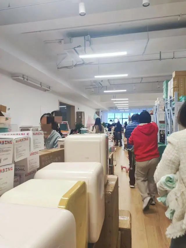 11月29日下午,可优比总部一楼的仓储店内人头攒动,货架上的婴儿睡袋、抱枕、被子被翻得七零八落,门口结账处甚至排起长龙。据了解,