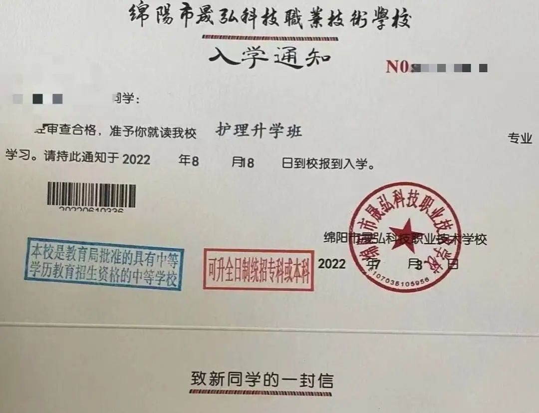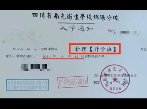记者从该校在读学生小徐(化名)手中获得的入学通知书显示,2022年小徐的入学通知书内容为:经审查合格,准许你就读我校护理升学班专业学习,请持此通知于2022年8月18日到校报到入学。此时,小徐入学通知书的印章已是绵阳市晟弘科技职业技术学校,而不再是南充卫生学校绵阳分校。