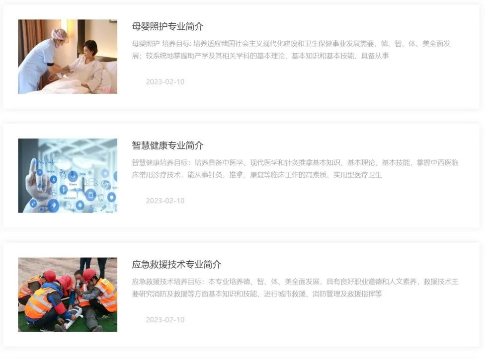 其中,母婴照护专业简介写道:所学专业以升入专科、本科学校为主(升学方向有临床医学、药剂、口腔、护理、医学美容技术)。专科或本科阶段可考取护士资格证书、助产士证书、育婴师资格证。记者搜索官网后并未看见有护理专业的简介说明。