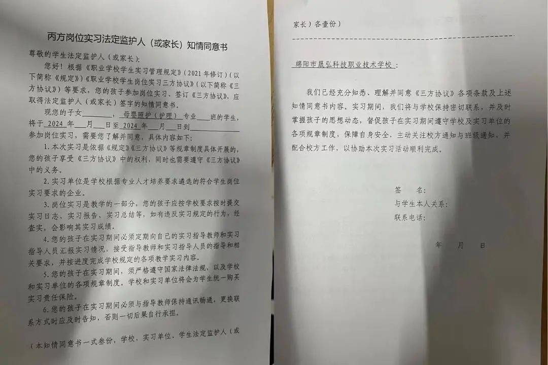 绵阳市晟弘科技职业技术学校丙方岗位实习法定监护人(或家长)知情同意书(受访者供图)