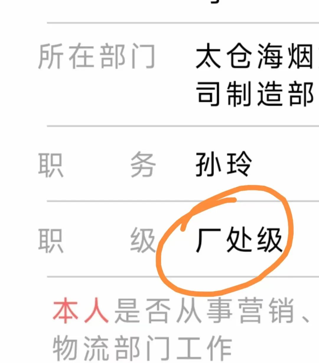 为了增进对彼此的了解,两人互发了照片,孙玲还发了自己的工卡、办公软件截图、“人员去向信息栏”图片,以证明自己“烟草公司高管”的身份。工卡信息显示“工号:640198,姓名:孙玲”,办公软件显示“所在部门:制造部,职级:厂处级”。