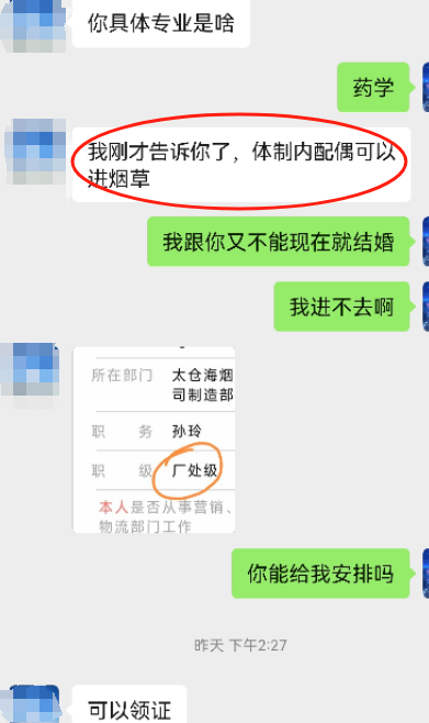 在后续几天的接触中,孙玲称自己是部门主管,他还向潘萍发了自己的工资条和购房合同,并称自己一年有50多万元的收入。他还主动询问潘萍,要不要进烟草,“想去,我给你资料录进系统。”当潘萍提出“你们把我安排进去吗?”,孙玲表示,不要疑问,相信就给我安排,不信我的就不要听。