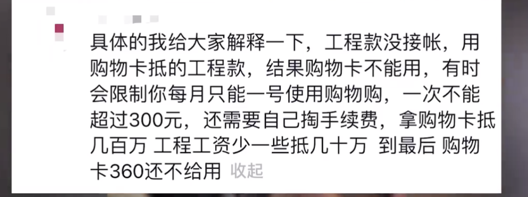 据风芒新闻,知情人士张女士称,单位没有给工资,给的是卡,金额达到几十万元,但是购物卡却用不了。