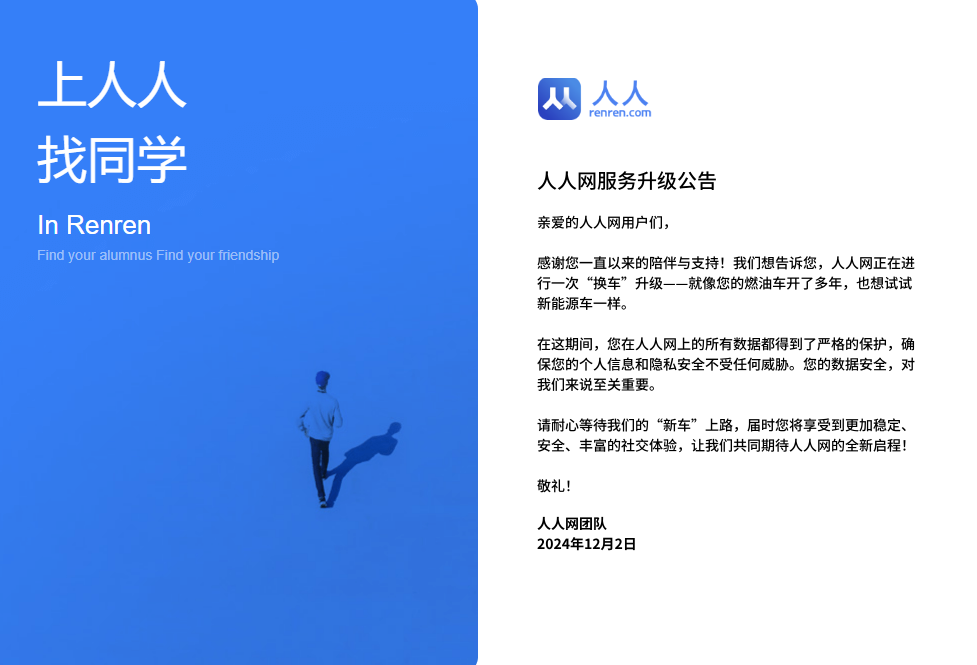 近日,不少网友在社交平台反馈称,人人网现在已无法登录,登录时会提示账号密码错误,疑似停止服务。 12月2日晚,人人网发布公告称,人人网正在进行一次“换车”升级。届时,将享受到更加稳定、安全、丰富的社交体验。 该公告称,在此期间用户在人人网上的所有数据都得到了严格的保护,确保用户的个人信息和隐私安全不受任何威胁。