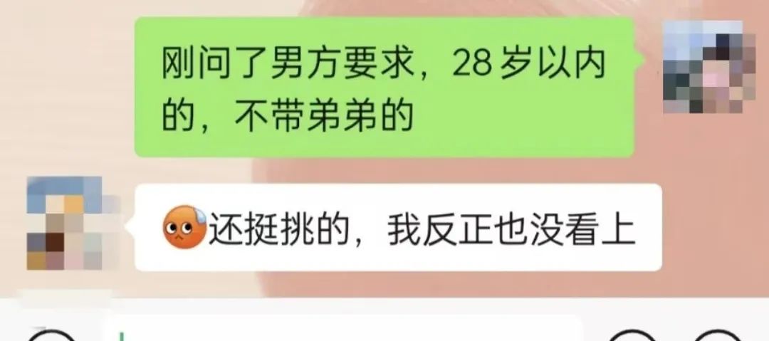 但人家也有有求啊,男方只要 28 岁以内不带弟弟的。小姐姐直接阴阳怪气地来了一句:“还挺挑的,反正我也没看上他。”