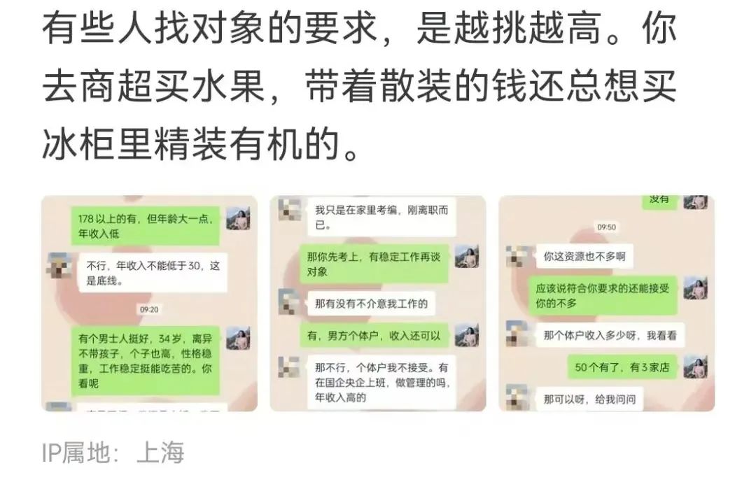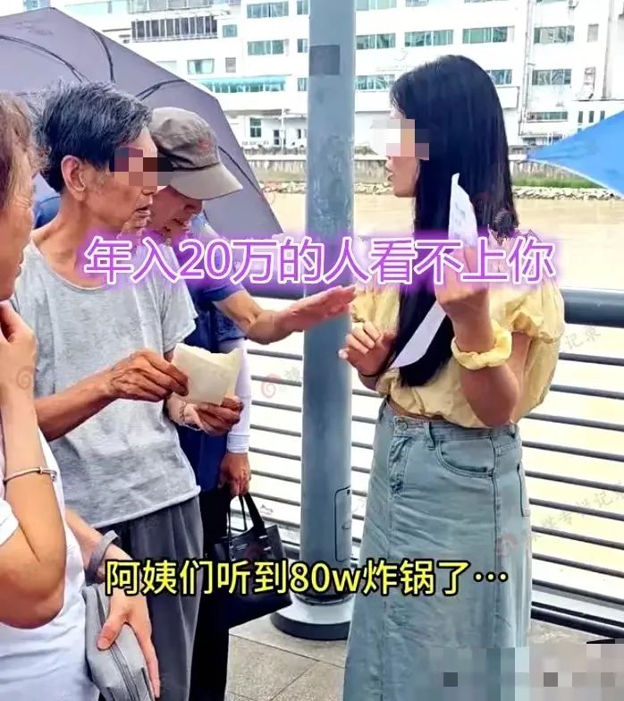问她有什么具体要求,说“男方不能比我矮,要年薪20万以上,这样才能支撑家里的消费,彩礼要80万,这个数字比较吉利”一名大爷则直接对女生说“年薪20万,还要拿出80万彩礼,这样的条件,他们为什么要娶你!”