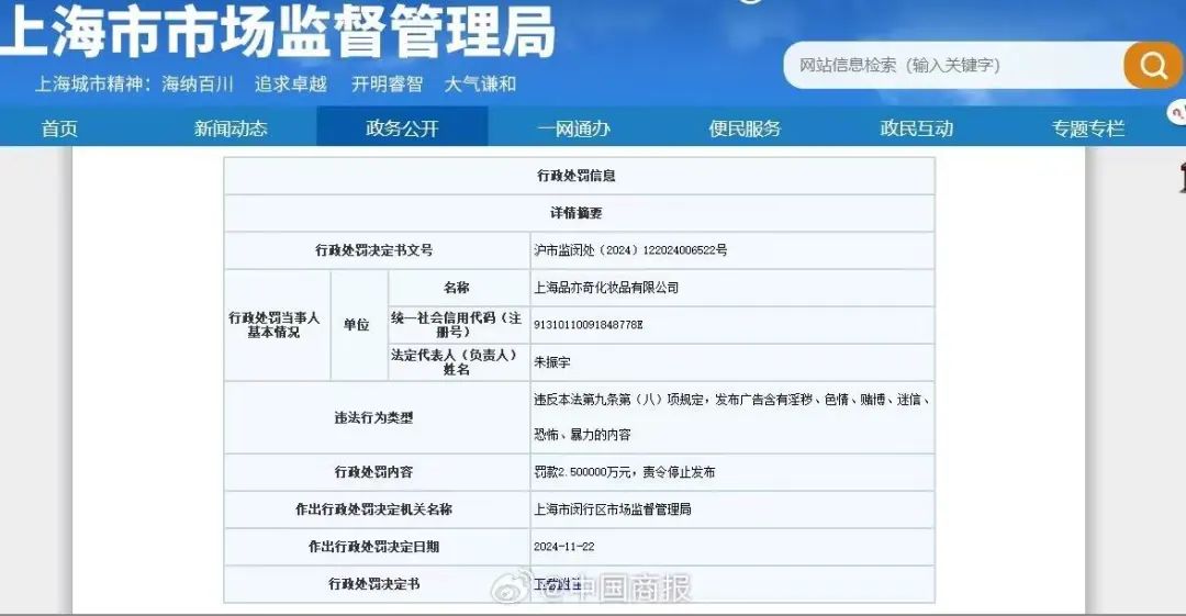 美妆品牌花洛莉亚关联公司上海品亦奇化妆品有限公司,因产品命名以及宣传图片中存在一定的性暗示被罚款2.5万。