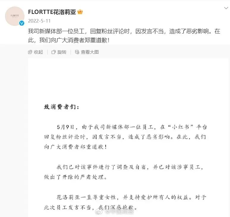 值得一提的是,这并非花洛莉亚首次因低俗宣传而受到争议。2022年5月9日,花洛莉亚在社交平台发布卧蚕笔新品预告并配文。在下方评论区有网友进行不当评论后,其官方账号对该评论进行回复,相关言论引发质疑。随后,花洛莉亚发布致歉声明称,该司新媒体部一位员工在回复粉丝评论时发言不当,造成了恶劣影响。“我们已对该事件进行了调查及自省,并对该涉事员工做出了开除的严肃处理。”