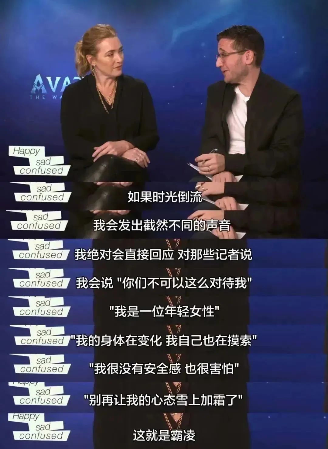 2023年初,在《阿凡达:水之道》宣传日程当中,凯特的一段采访对话就引起了大家的注意。谈到当年《泰坦尼克号》上映时期,她曾遇到过许多媒体报道攻击她的身材“胖”,虽说当时自己备受伤害,但她表示若时光倒流,她一定会大胆反击。