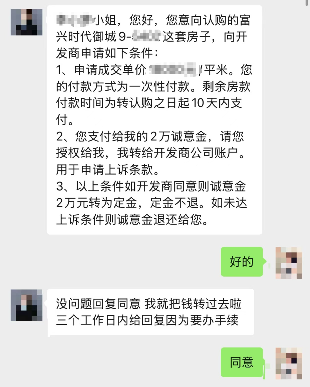 12月3日,记者与李女士一起来到富兴CFC营销中心。一名女性工作人员表示,李女士所提出的价格已经超出公司的既定价格,这边一直是按照协商的流程向公司领导申请审批,“如果没有申请下来,我们是要把钱退给她的;申请下来的话,她是要购买这套房子的。”“在申请成功的通知下来后,中介让李女士过来办手续,但在这个时候对方说不要房子了,这也给我们企业带来了损失。做生意来说的话,中途反悔怎么搞?” 另一名工作人员称,开发商这边已经达到了李女士申请的价格,也给对方发了“同意转定”的微信,双方是有个过程的。“就跟你去买件衣服或者去买黄金首饰一样的,你离柜了还概不退还。我们是给了缓冲的时间的,一旦把价格申请下来,这笔钱是自动转为定金的。”该工作人员称,在中介说了谈好之前的价格后,李女士自始至终只回复“太贵了”,也没有说不买。现场,李女士与开发商负责人进行了进一步协商。“对方说可以退一半的钱,我不同意。”李女士说。当天,双方协商未达成一致。李女士表示,先将此事进行曝光,还在思考后续如何处理。