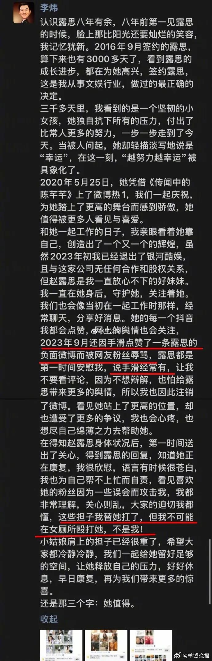 随后,银河酷娱前CEO李炜被曝在朋友圈发长文回应赵露思事件,表示2016年签下赵露思是自己从事文娱行业以来做得最正确的决定之一,并透露自己一直以来将赵露思视为妹妹,绝对没有在女厕所殴打赵露思,二人一直是互相支持的良好关系。