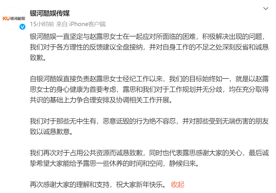 1月1日晚,赵露思经纪公司银河酷娱传媒发文:“银河酷娱一直坚定与赵露思女士在一起应对所面临的困难,积极解决出现的问题,我们对于各方理性的反馈建议全盘接纳,并对自身工作的不足之处深刻反省和诚恳致歉。”