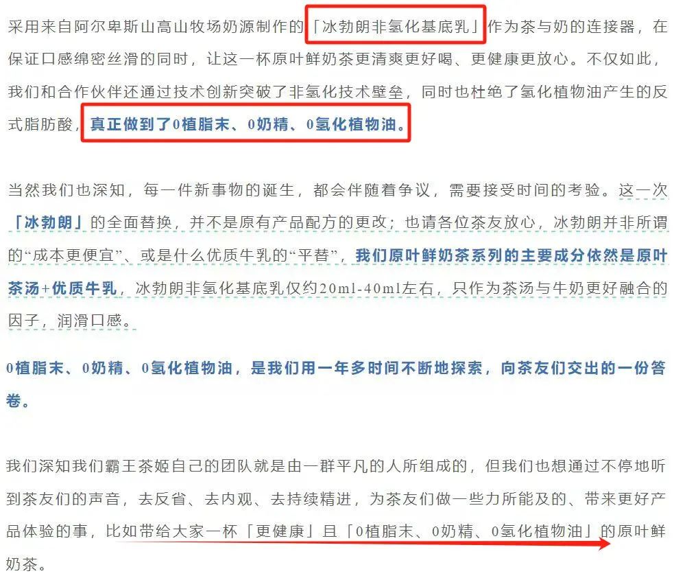 值得注意的是,霸王茶姬在其2023年7月28日官方微博账号中关于植脂末相关科普内容中也提到,在霸王茶姬原叶鲜奶茶系列中主要成分是原叶茶汤、优质牛乳和冰勃朗非氢化基底乳,冰勃朗含量约20ml至40ml左右。“采用来自阿尔卑斯山高山牧场奶源制作的‘冰勃朗非氢化基底乳’作为茶与奶的连接器,在保证口感绵密丝滑的同时,让这一杯原叶鲜奶茶更清爽更好喝、更健康更放心。”冰勃朗不含反式脂肪酸,“更健康”且“0植脂末、0奶精、0氢化植物油。”