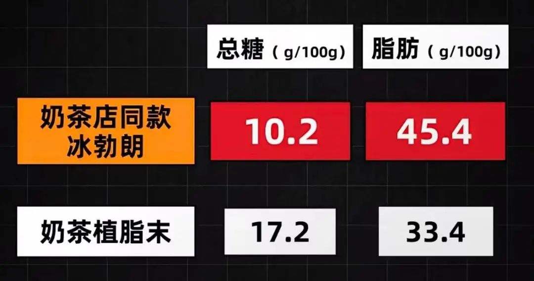 博主将植脂末与冰勃朗送检发现,植脂末检出了反式脂肪酸,而“冰勃朗”则未检出。但后者相较植脂末来讲,糖和脂肪含量并没有明显降低。脱水以后,“冰勃朗”的总糖和脂肪含量分别是10.2,45.4;植脂末是17.2和33.4。脂肪含量比植脂末还高了。更让消费者感到“扎心”的是,其宣传中提到的“阿尔卑斯山高山牧场奶源”,实际含量却不足4%。换句话说,这款号称“健康”的茶饮背后,更多依赖的是添加剂和人工调配,而非优质天然原料。