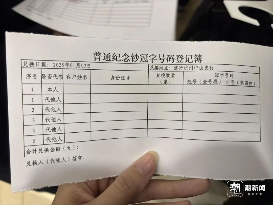 工作人员依次询问排队的市民是否兑换纪念钞,并向兑换纪念钞的市民发放了一张“普通纪念钞冠字号码登记簿”。“今天既有纪念币,也有纪念钞,大