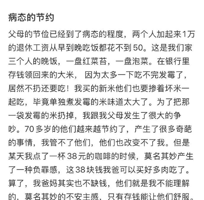 而这样的事根本不是个例,我们身边有太多人因为过度节俭,导致得不偿失,既损害了身体,又消耗了家庭的幸福。